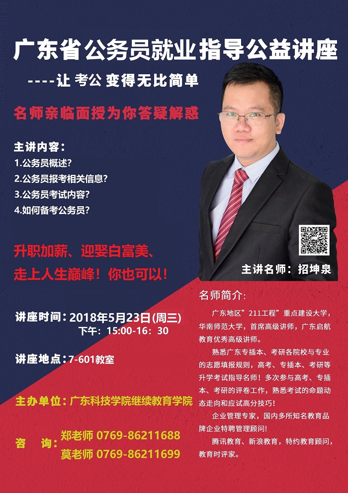 广东省公务员就业指导公益讲座将于5月23日(周三)下午15:00-16:30在7-601教室举行,名师亲临面授为你答疑解惑。