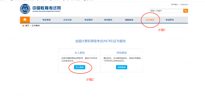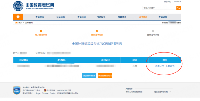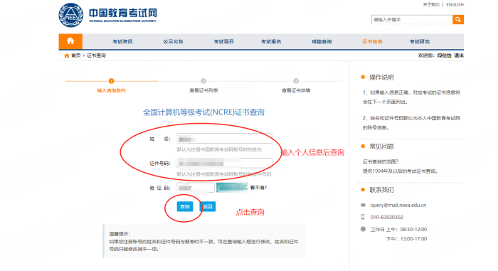 登录考生个人端→输入个人账号密码→点击证书查询→点击本人查询→输入姓名、证件号、验证码后点击查询→点击查看证书、下载证书。