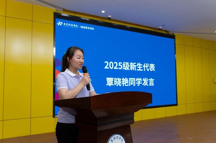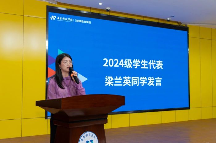 2024级工商管理专业梁兰英同学分享了自己的学习感悟。她提到,继续教育是对人生的郑重选择,尽管有人质疑她“30多岁为何还要折腾”,但她坚信“人生没有太晚的开始”。同时她分享了三点学习心得:一是接纳多重身份,将学习融入生活;二是善用校园资源,主动请教和交流;三是注重自我成长,把学习当作发现不足、明确方向的旅程。最后,她希望同学们以广东科技学院为起点,勇敢追梦,让这段学习历程化为人生的骄傲勋章。