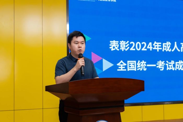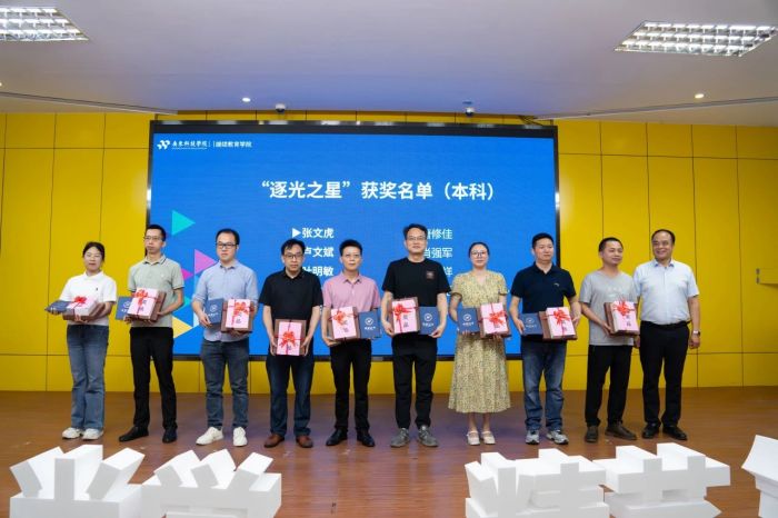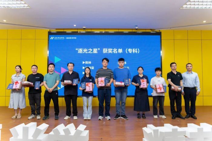 在方鑫源副院长宣读《关于表彰2024年成人高等学校招生全国统一考试优秀学生的决定》后,20名优秀学员荣耀登台,他们以卓越的成绩荣获“逐光之星”荣誉称号。院长曹长锦、副院长陈文宝分别为获奖者颁发荣誉奖品及荣誉证书,肯定他们的努力与收获。与此同时,云端直播间线上观众热情互动,掌声与喝彩此起彼伏,将现场氛围推向了高潮。