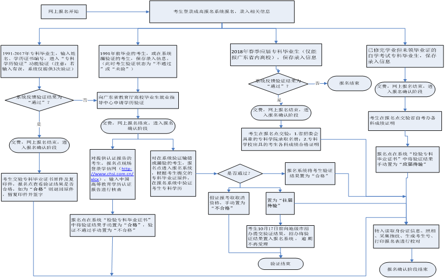 2.做好专升本在线学历验证。报考专升本且已经取得专科毕业证书的往届考生,在网上报名时须在报名系统“专科学历验证”模块输入专科毕业证书信息,进行专科学历验证。报考专升本的应届专科毕业生,在网上报名时须在报名系统“专科学籍查验”模块输入本人身份证号码和姓名等信息,进行专科学籍查验。验证结果分“通过”和“不通过”两种。学籍查验“不通过”的,不予报考。若专科学历验证结果为“不通过”,考生须自行前往广东省教育厅高等学校毕业生就业指导中心学历鉴定部进行学历验证,并凭其出具的“中国高等教育学历认证报告”(学历验证可能需要约30天时间,请务必有足够的提前量),于10月17日前向地级市招生办公室提交验证结果。学历验证“不通过”且未能按时向地级市招生办公室出具“中国高等教育学历认证报告”的考生,不予发放准考证,不安排考试。申请专科学历验证的考生也须在规定时间(9月6-10日)内,到报名点现场采集照片和指纹信息,逾期不予报考。交纳了报考费的考生可保留报考资格至10月17日。考生现场确认报名时须交验专科毕业证书原件及复印件。考生凭假证或其他不符合报考条件的证件报名的,何时发现,何时取消考生的报考或录取资格,由此产生的后果由考生本人负责。