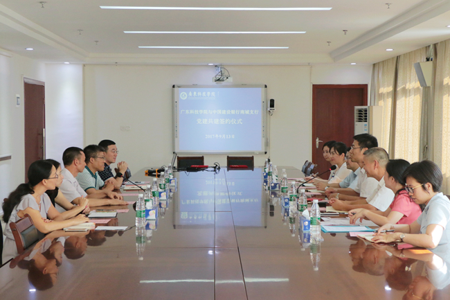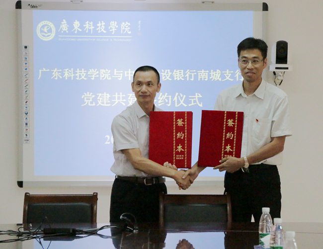 本网讯 (齐留柱)9月13日下午,我院党委和中国建设银行东莞南城支行在行政楼512举行了党建共建签署仪式,我院党委书记梁瑞雄和建行东莞南城支行党总支书记李勋鳌签署《广东科技学院与建行党建共建协议书》,全面启动校企之间的党建共建。
